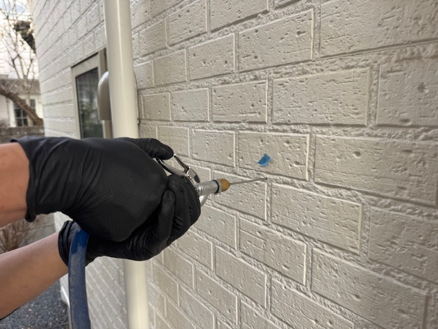 外壁に小さな穴をあけ、そこからシロアリの予防薬剤を丁寧に散布しました。